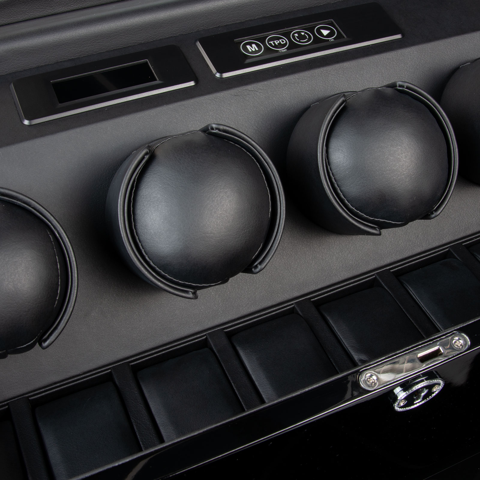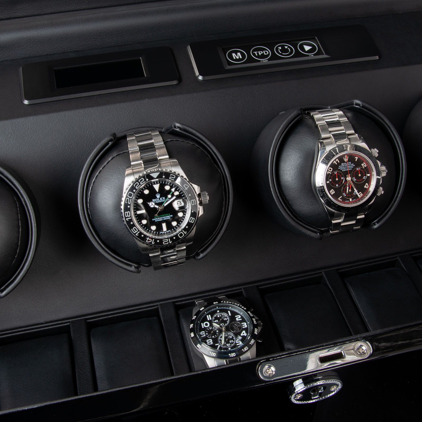 Die Benutzerführung setzt Maßstäbe in puncto Innovation: Über das berührungsempfindliche Touch-Interface werden alle Einstellungen vorgenommen. Für jede Uhr individuell lässt sich die Drehrichtung sowie die Anzahl der Umdrehungen pro Tag (650, 950, 1250 oder 1850) bestimmen, um den unterschiedlichen Anforderungen der Automatikmechanismen gerecht zu werden. Das übersichtliche Display zeigt nicht nur die gewählten Einstellungen, sondern auch die aktuelle Uhrzeit an, was den Abgleich der Präzision Ihrer Sammlung zum Kinderspiel macht.