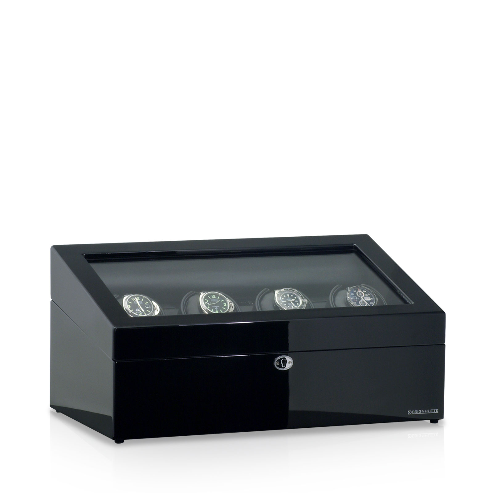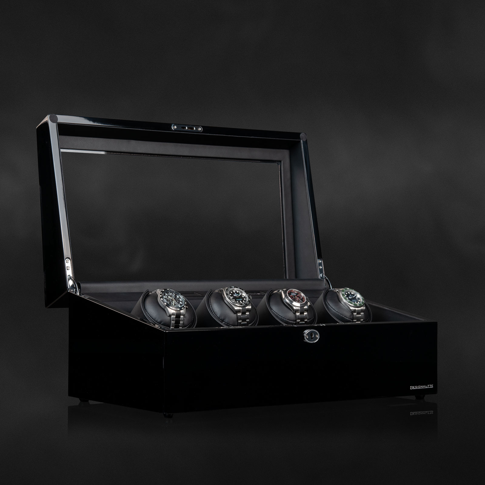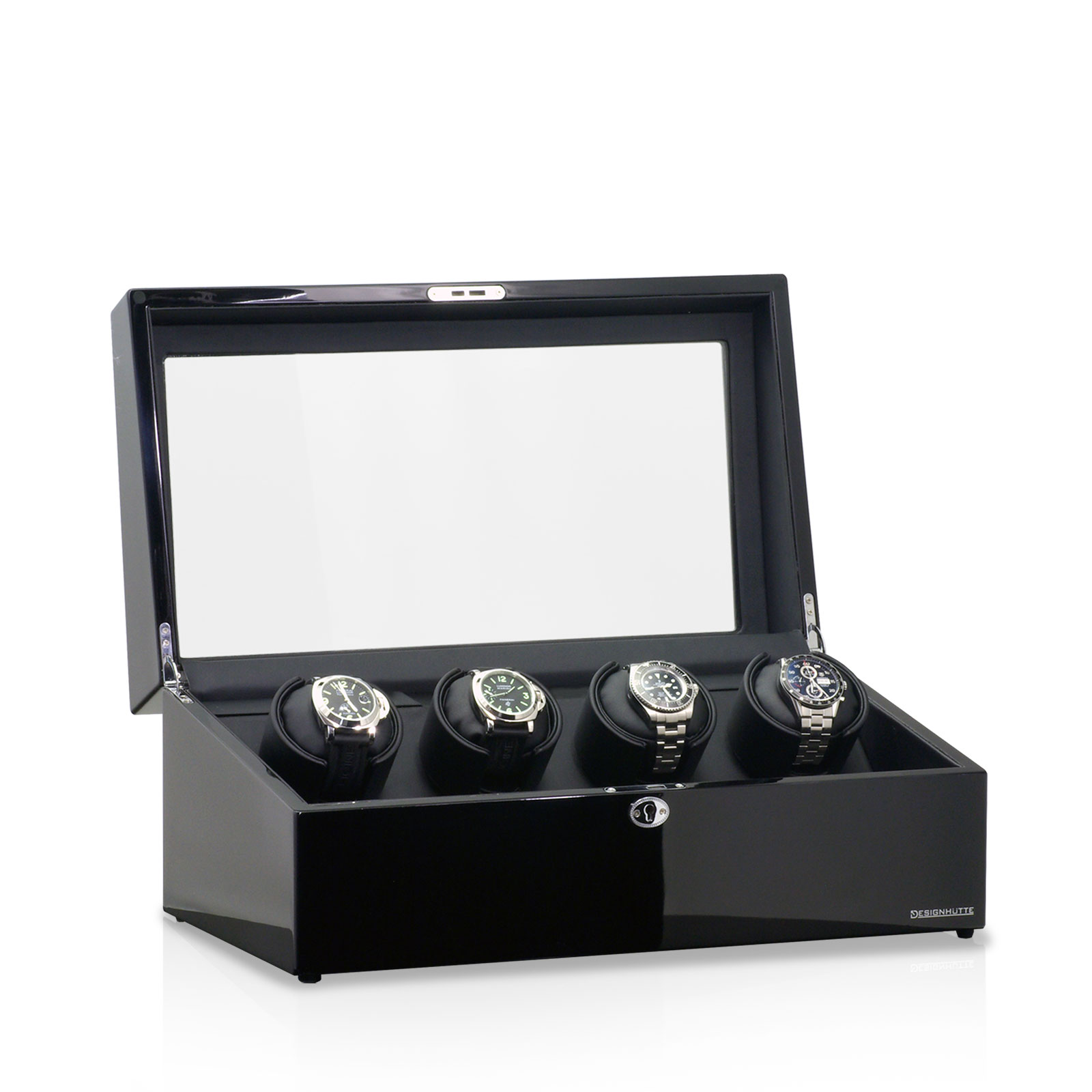 Das durchdachte Design bietet zusätzlich im vorderen Bereich genügend Platz, um vier oder acht weitere Uhren sicher und sichtbar zu lagern. So werden die Automatikuhren nicht nur funktional aufgezogen, sondern auch stilvoll präsentiert.