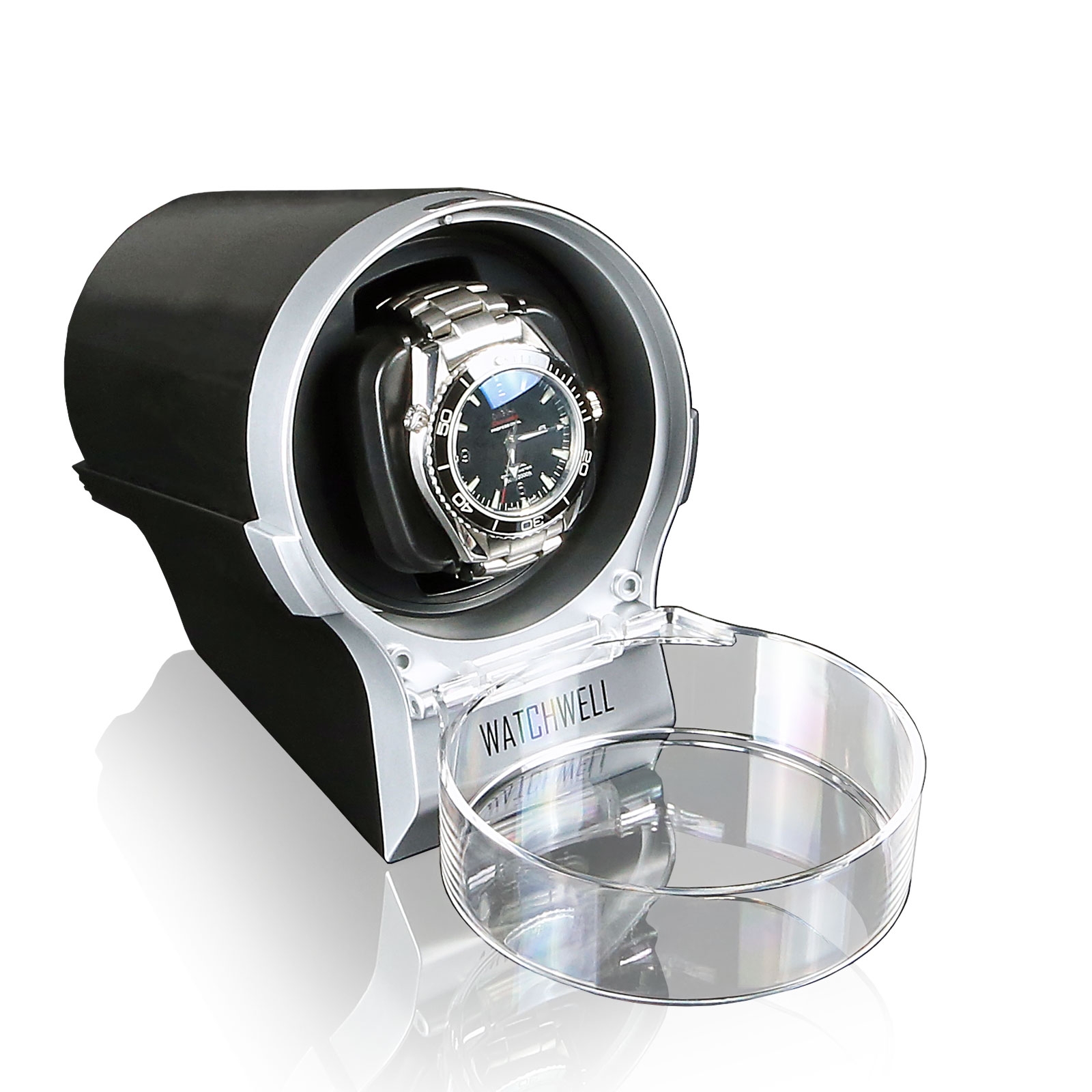 This watch winder is thanks to its small design the ideal companion when travelling. Despite the small design, this watch winder has 12 different programs for winding automatic watches. The watch is protected from dust and dirt behind a plexiglass disc that can be swung down to the front. The attachment of the wristwatch is made on a flexible adjustable watch clasp (approx. 150-200mm). Two "noses" located on the watch clasp ensure that the watch is locked in the watch winder. The contact surface of the watch clasp is approx. 55mm. Since the watch clasp does without lateral limitation, even large watches find room without problems.