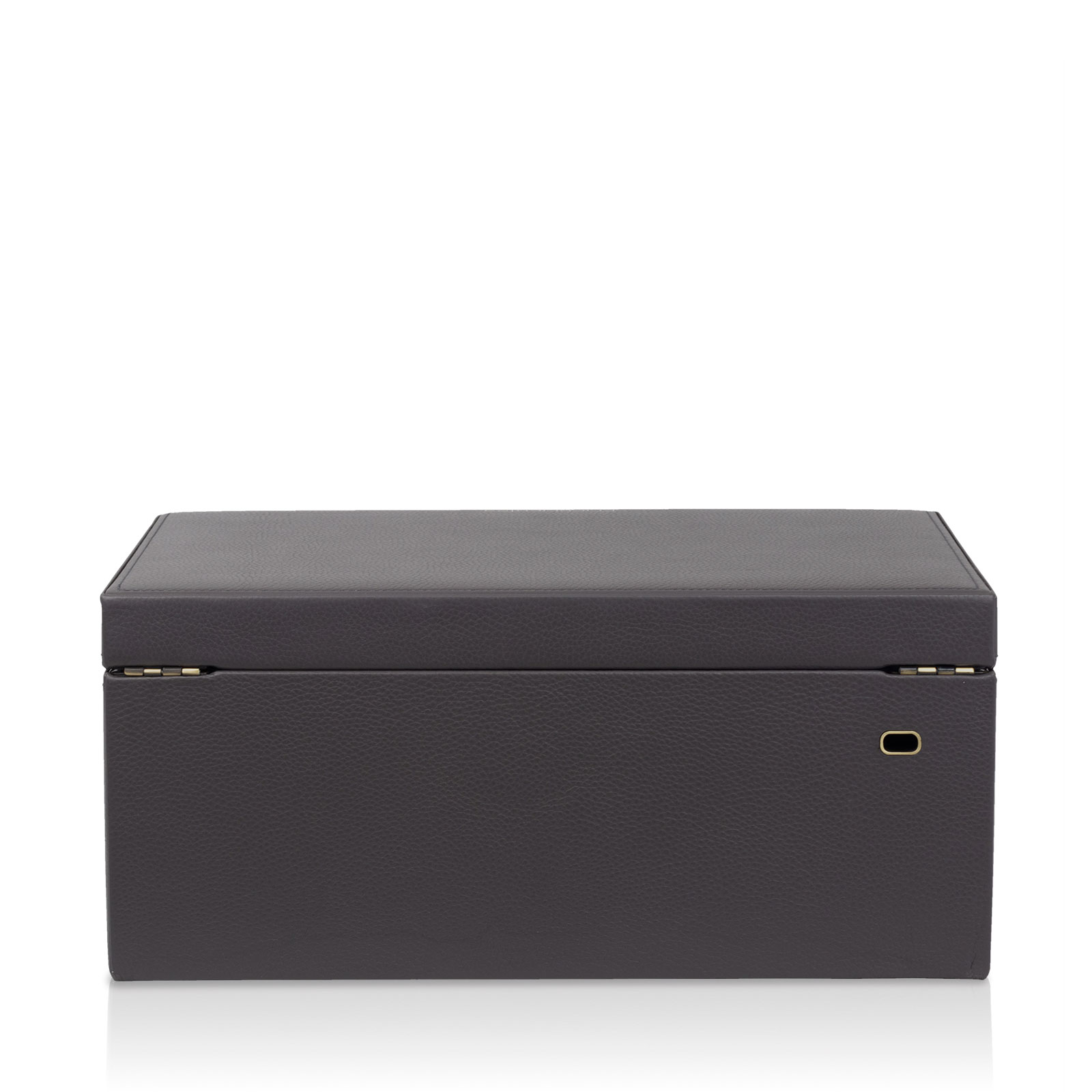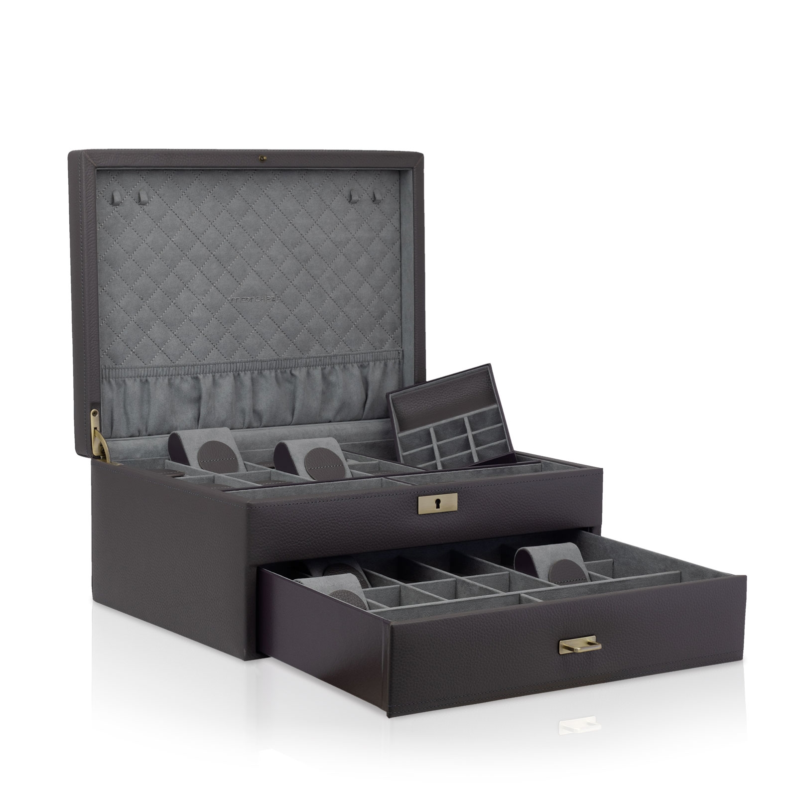 Cuatro ganchos de cadena para pulseras y collares, así como una gran tira con volantes en la tapa Compartimento superior con 8 grandes almohadillas para relojes