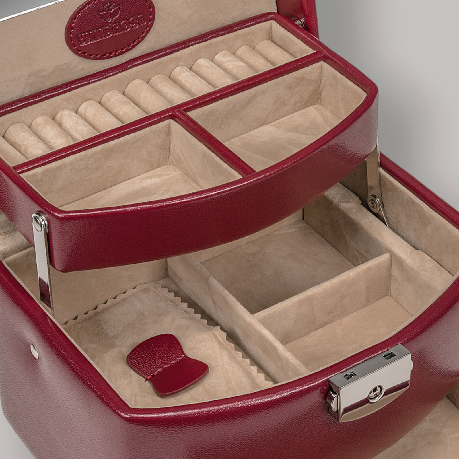 | Équipement: | Compartiment automatique (s'ouvre automatiquement à l'ouverture), Coussinets d'anneau, Miroir intégré, Petits compartiments pour breloques / bagues / boutons de manchette, Poche cousue, Poignée de transport |