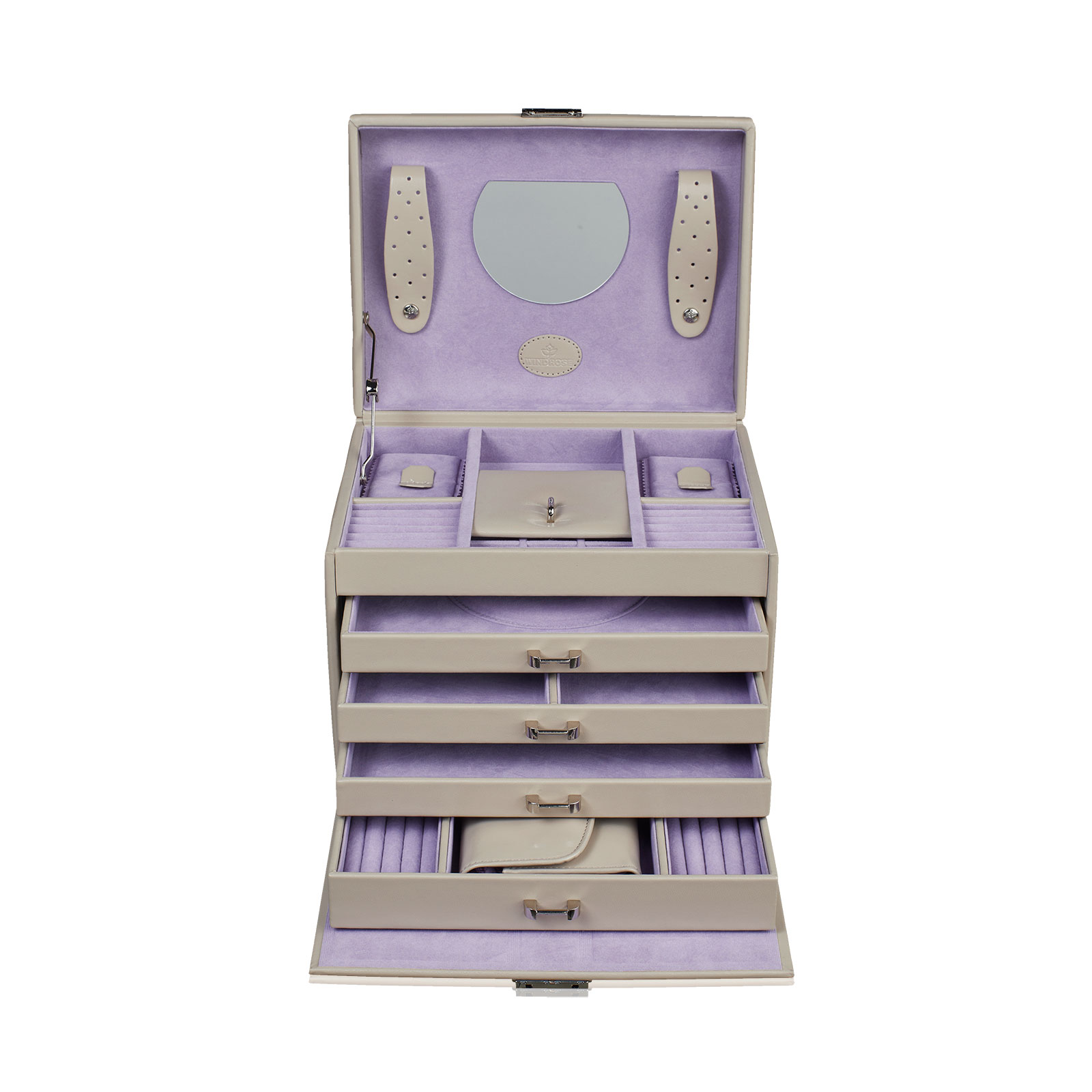 | Équipement: | Coussinets d'anneau, Miroir intégré, Petits compartiments pour breloques / bagues / boutons de manchette, Poignée de transport, étui de voyage amovible |